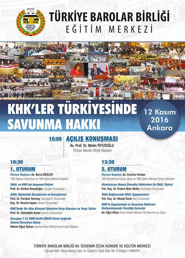 Açılış Konuşmasını Av.Metin Fevzi Oülunun yapacağı "Khk'ler Türkiyesinde Savunma Hakkı" konulu seminer, Türkiye Barolar Birliği Av Özdemir Özok Kongre ve Kültür Merkezinde gerçekleştirilecek.