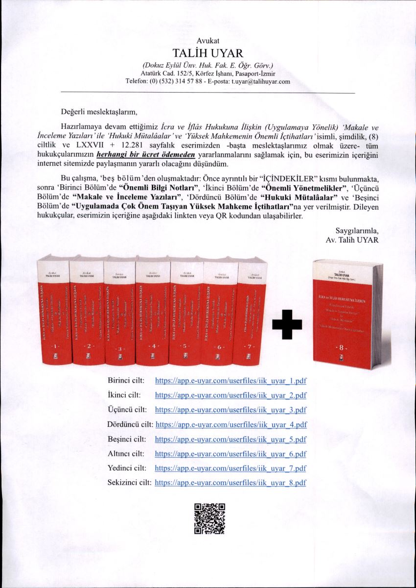 AVUKATA ÖZEL Avukat Talih UYAR Kitap Linkleri01.01.2026 Tarihinden İtibaren Geçerli Tavsiye Niteliğindeki Avukatlık Ücret Tarifesi05.11.2024 -05.11.2025 Tarihleri Arası Tavsiye Niteliğindeki Avukatlık Ücret Tarifesi7269 Sayılı Kanun Ve Bağlı Yönetmelikler Kapsamında 6 Şubat 2023 Depremleri Ve İdarenin Sorumluluğu RaporuMuğla Sıtkı Koçman Üniversitesi Adli Tıp Anabilim Başkanlığı 2026 yılı bilirkişilik hizmet ücretleriNakil İçin Gerekli BelgelerYabancıların Türkiye’de Gayrimenkul Alım, Satım, Miras ve Vatandaşlık İşlemleriBİLİŞİM SUÇLARI SEMİNERİ NOTLARUygulamada “Mücerretlik İlkesi” ve “Hayatın Olağan Akışı”Kavramlarının Düşündürdükleri (Av. Talih UYAR)Mal Rejiminin Tasfiyesi(Hakim Emin Erol)“MUVAZAA (TBK.m. 19) NEDENİNE DAYALI TASARRUFUN İPTALİ DAVALARI” İLE “İİK.m. 277 vd. DAYALI TASARRUFUN İPTALİ DAVALARI”NIN KARŞILIKLI ÖZELLİKLERİ VE SONUÇLARI HAKKINDA ‘BİLGİ NOTU’Adli Tıptan İstenebilecek RaporlarDisiplin HukukuAvukatlık KanunuSuça Sürüklenmiş Çocukların Tahliyelerini Kolaylaştırmak İçin Başvuruya Dair Dilekçe ÖrneğiBilgi Edinme HakkıAvukat Ortaklığı Sözleşmesi ÖrnekleriMesleki ilkeler ve disiplin kurallarıYönetmelikler05.11.2024 -05.11.2025 Tarihleri Arası Tavsiye Niteliğindeki Avukatlık Ücret Tarifesi